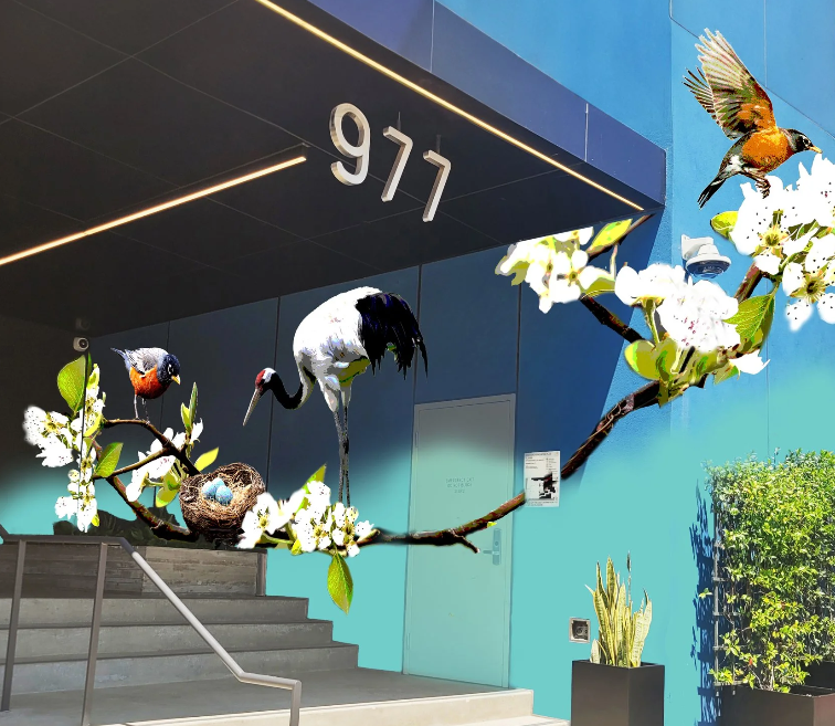 A stunning new mural, After the Good Day’s Work, by artist Trinh Mai, now adorns the LACERS building at 977 N Broadway in Chinatown. Featuring American Robins and Red-crowned Cranes among white plum blossoms, it symbolizes resilience, longevity, and hope—honoring those who build a better future and offering a space for reflection across generations.